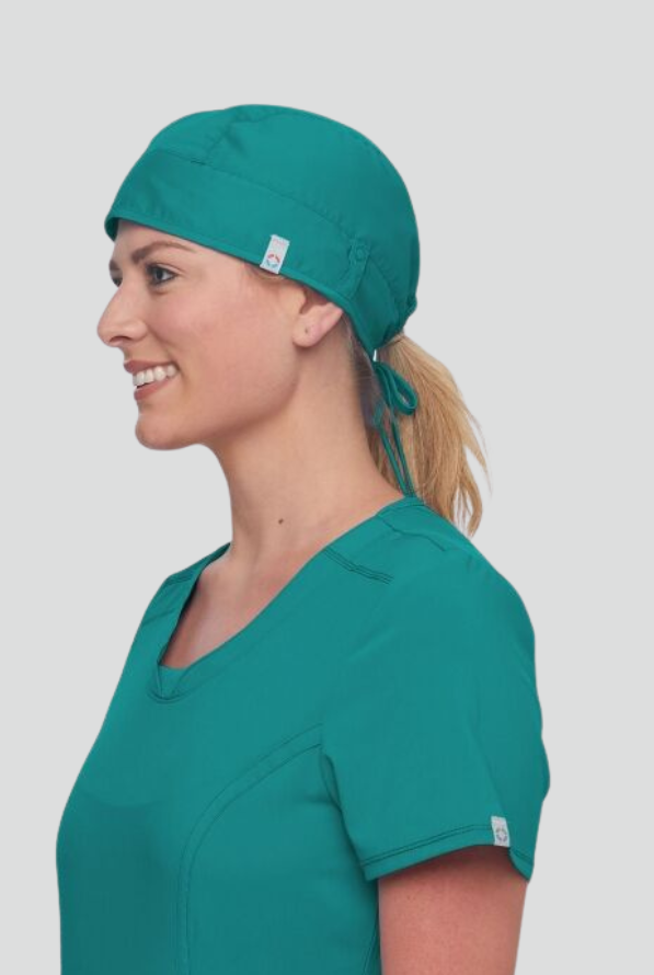 Praktična medicinska kapa koja se lako prilagođava zahvaljujući vezanju pozadi.